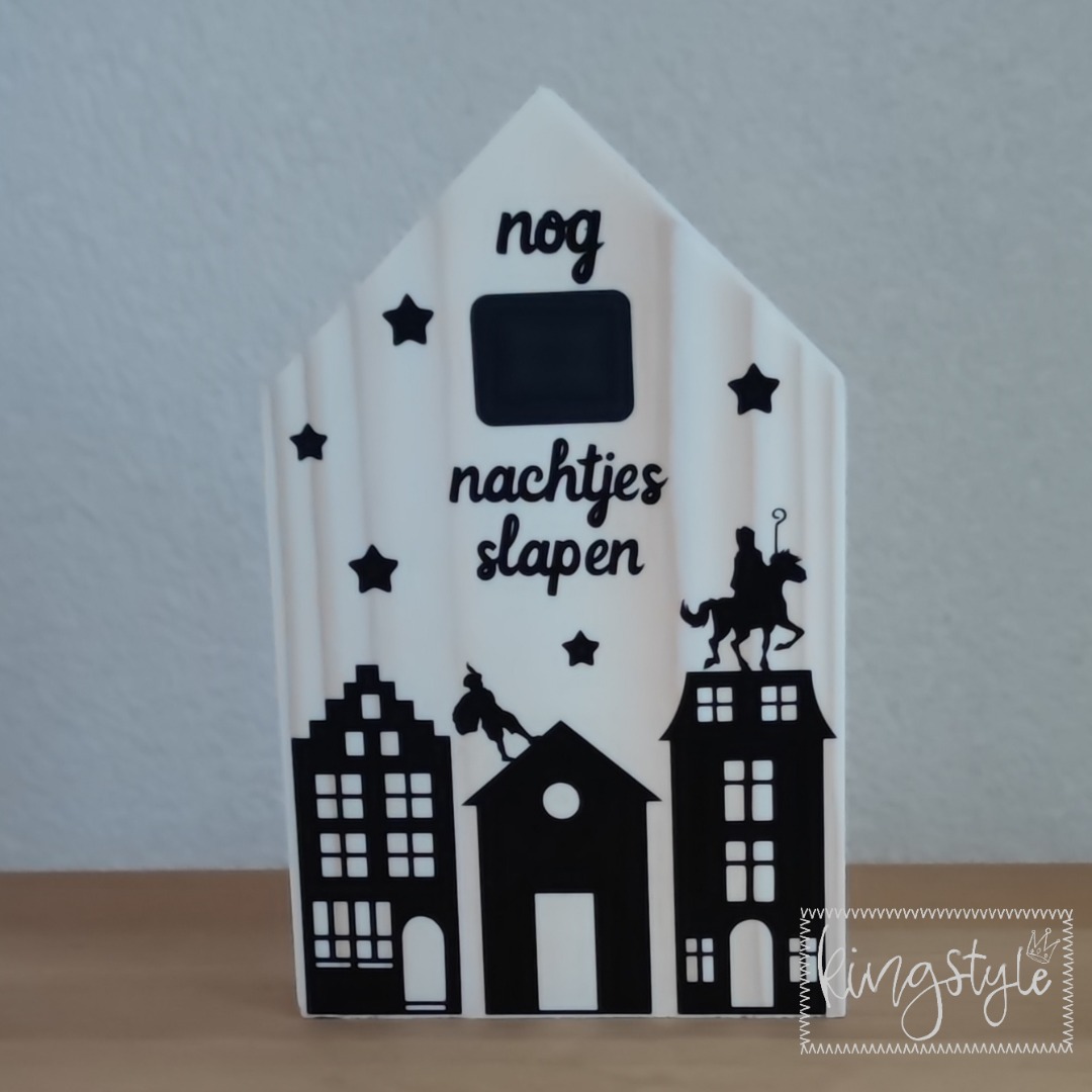 Dit leuke houten huisje is bedrukt met verschillende huisjes. De sint op zijn paard staat op een van de daken en een piet met zak loopt op het dak. in de lucht zijn verschillende sterren te zien. Dit huisje heeft de tekst: nog … nachtjes slapen. Het vakje is te beschrijven met een schoolbordkrijtje, net als een krijtbord. Je kunt het elke dag weer uitwissen en weer een ander cijfer opschrijven. Voor kindjes die al kunnen schrijven is dit ook leuk om zelf elke dag in te vullen.