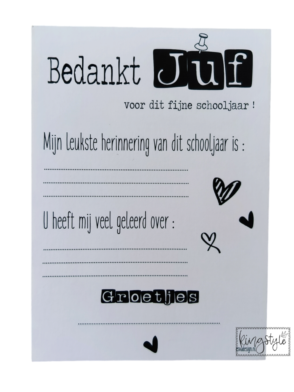 Op de achterkant kan je kind wat dingen invullen over de juf, dit maakt de kaart echt persoonlijk en uniek.