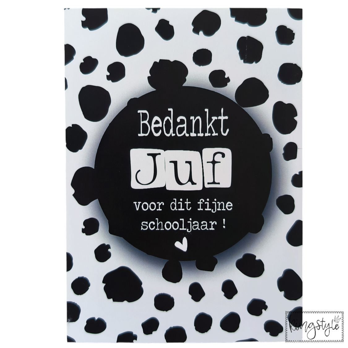 Deze leuke zwarte witte kaart met daarop de tekst Bedankt juf voor dit fijne schooljaar is erg leuk om te geven aan de juf aan het einde van het schooljaar.