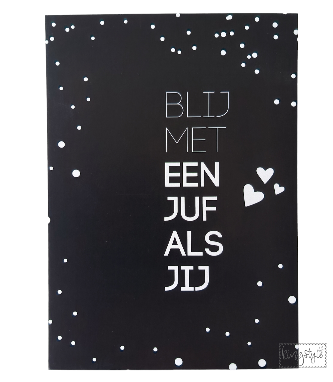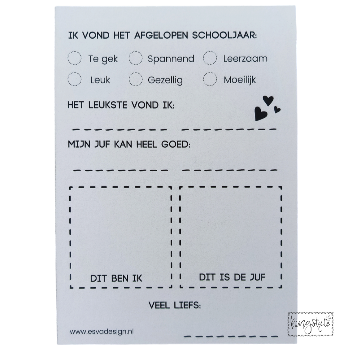 Deze leuke invulkaart met de tekst ‘Blij met een juf zoals jij’ is leuk om te geven aan het einde van het schooljaar. Op deze kaart kan je kind aan de achterkant dingen invullen over de juf en het schooljaar, dit maakt deze kaart heel persoonlijk en uniek.
