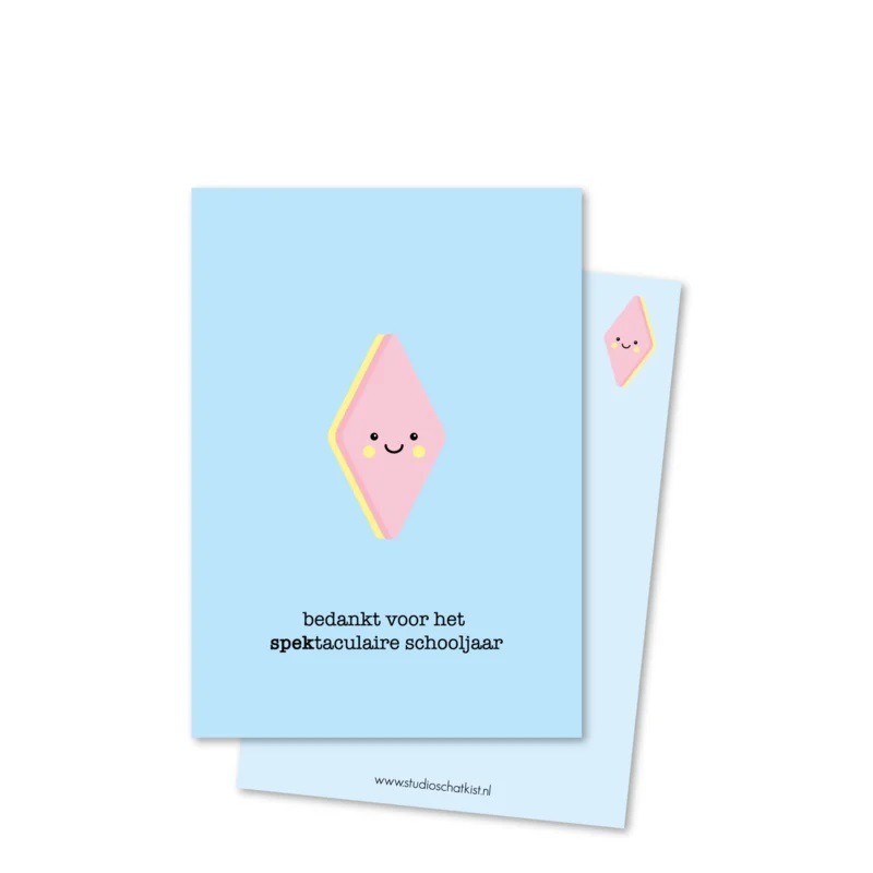 Deze leuke kaart van studio schatkist met een afbeelding van een vrolijk spekje en de tekst ‘Bedankt voor het spektaculaire schooljaar’ is ontworpen om geven of te sturen aan het eind van het schooljaar. Deze kaart is erg leuk voor een juf of meester aan het eind van het schooljaar, maar is natuurlijk ook erg leuk voor stagaires of andere medewerkers op school.