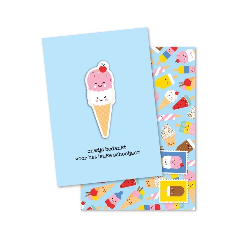 Deze leuke lichtblauwe kaart met een magneet in de vorm van een ijsje is van het merk studio schatkist. Deze kaart met magneet is erg leuk voor een juf, meester, stagair of onderwijsassistent aan het eind van het schooljaar.