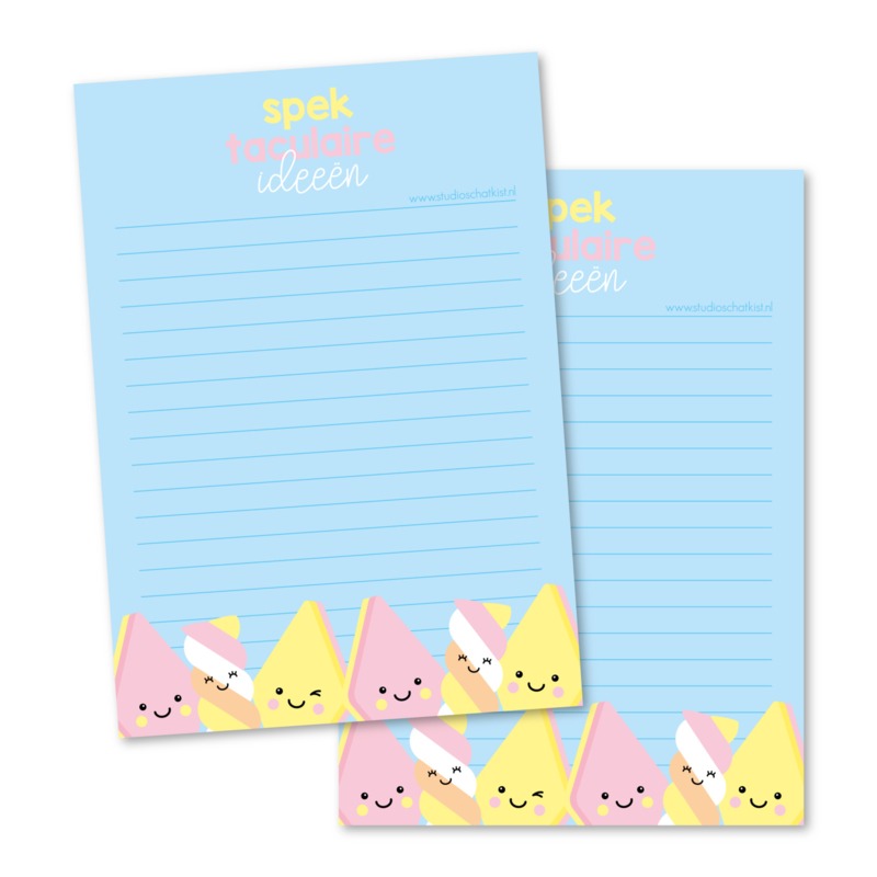 Dit leuke notitieblok met spekjes met vrolijke gezichtjes erop van het merk Studio Schatkist is heel leuk voor jezelf of om cadeau te geven.