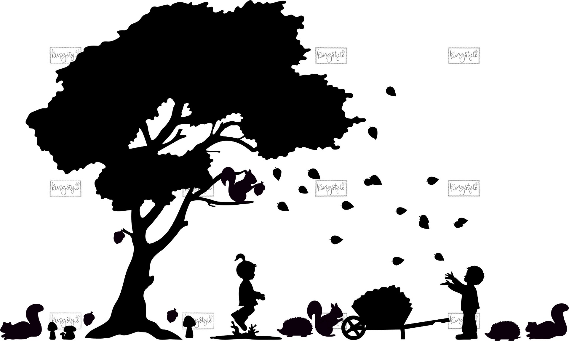 Inhoud: Je krijgt in deze set een grote boom, 2 kinderen, een kruiwagen met blaadjes, egels, eekhoorns, paddestoelen, losse blaadjes en eikeltjes.